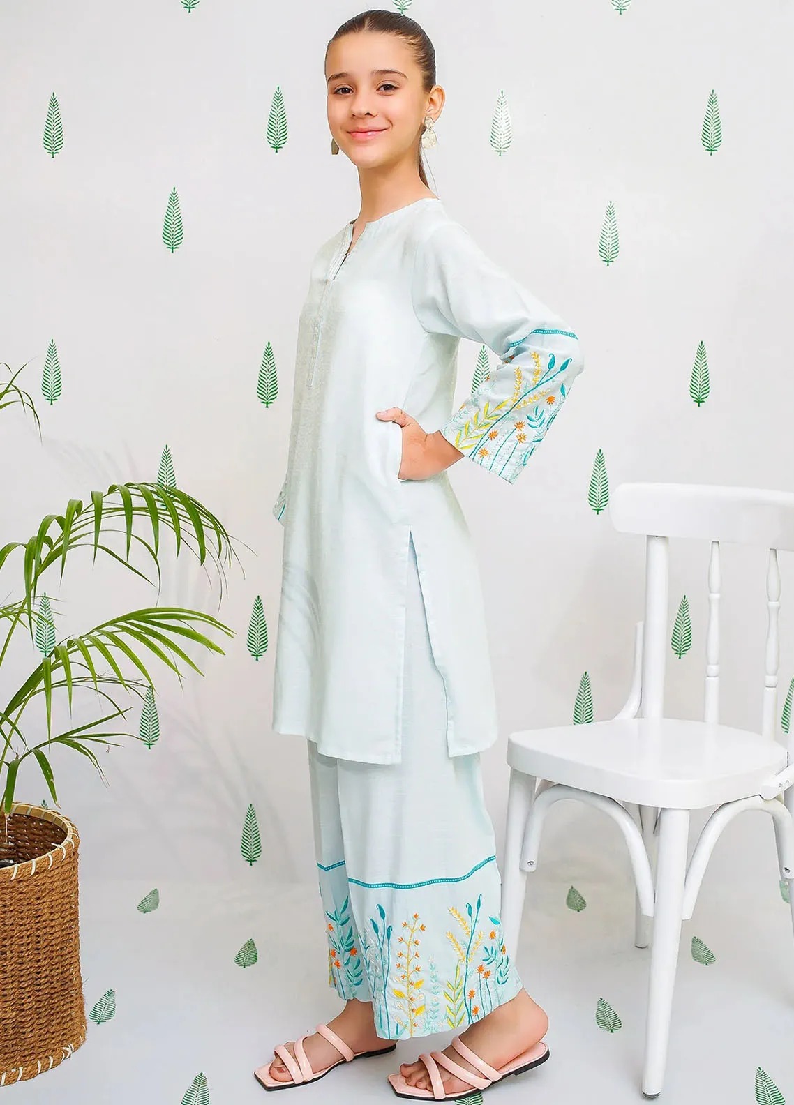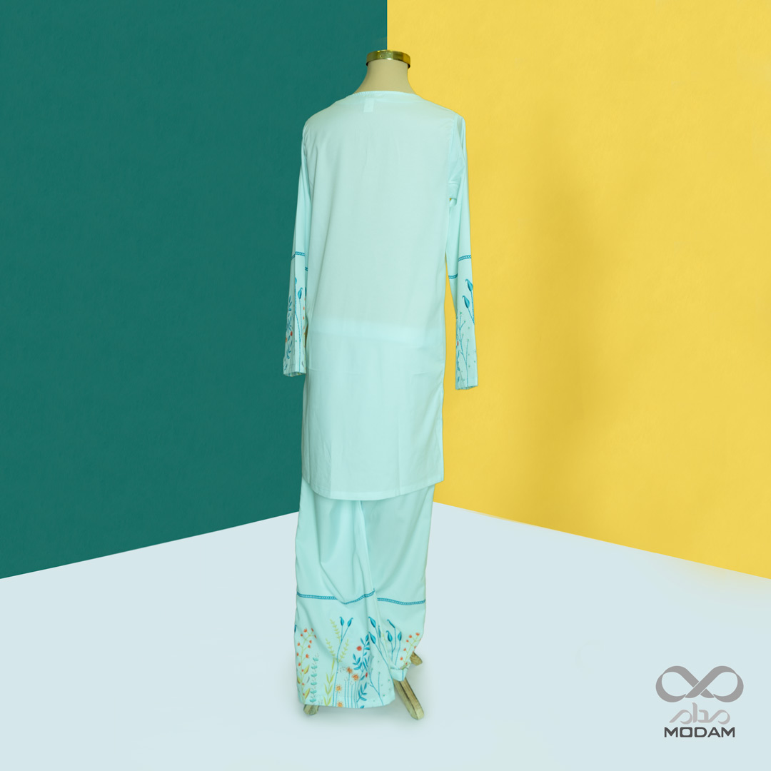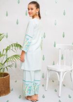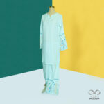 این ست زیبا شامل یک کُرتای آبی یخی از پارچه چمبری نخی است که با گلدوزیهای ظریف تزئین شده و همراه با شلوار Dhaka چمبری همرنگ ارائه میشود که دارای گلدوزی هماهنگ با بالاتنه است.