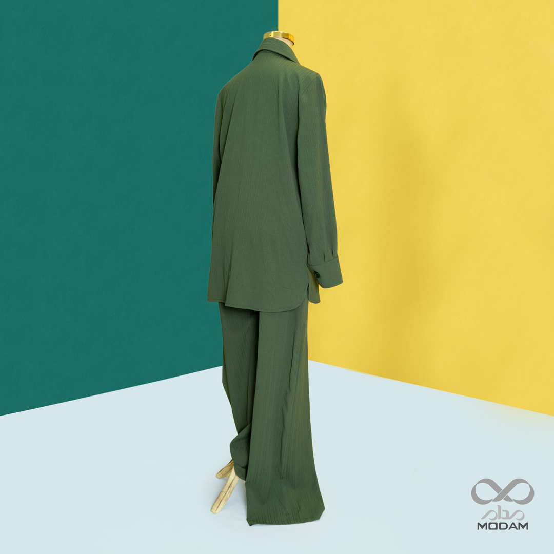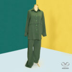 این ست دو تکه زنانه از برند SHEIN شامل یک بلوز یقه گرد آستین حلقه ای بلند و شلوار جلوبسته است که برای روزهای بهاری و تابستانی عالی است.