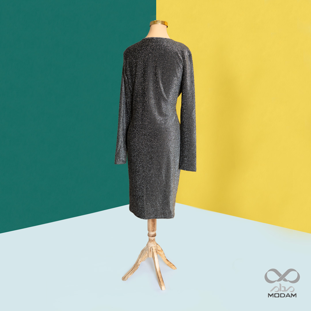 پارچه براق و درخشان برای جلوهای خاص و لوکس – طراحی پیچخورده در قسمت کمر که فرم بدن را زیباتر نشان میدهد – یقه هفت (V-neck) شیک و جذاب – آستینهای بلند برای استایلی شیک و رسمی – فرم مدادی با قد تا زانو مناسب برای مهمانیها و مجالس – جنس: 100% پلیاستر با کشسانی متوسط -مناسب برای شستشو با ماشین لباسشویی یا خشکشویی حرفهای