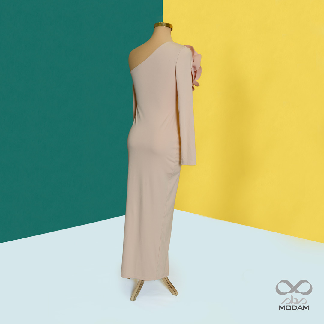 پیراهن صورتی مجلسی با یقه نامتقارن – ظرافت و جذابیت در یک نگاه!
